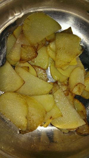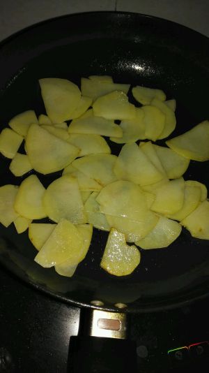 土豆切片,锅热放油,把土豆片煎熟