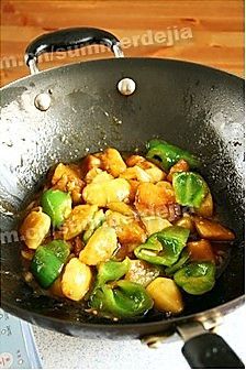 锅中多放些油,七成热时,将三种蔬菜分别过油,土豆和茄子约炸两三分钟捞出,青椒过油后立即捞出;