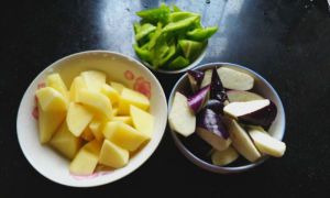 土豆、茄子去皮切滚刀块,青椒切滚刀块;
