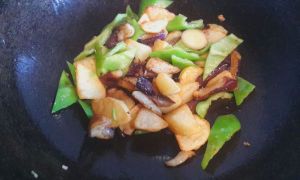 留少许底油 爆香葱白和姜片 然后倒入青椒 茄子 土豆翻炒 倒入调料汁炒匀 撒上蒜末即可~