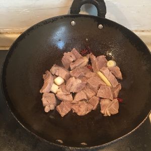 放油 干辣椒 花椒 大料 桂皮 香叶 再放洋葱 蒜片 放牛肉 放酱油 一点料酒 一点冰糖 一点白胡椒