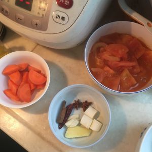 番茄去皮 切块。用油翻炒出汁加水煮片刻。胡萝卜焯水。葱姜蒜切段