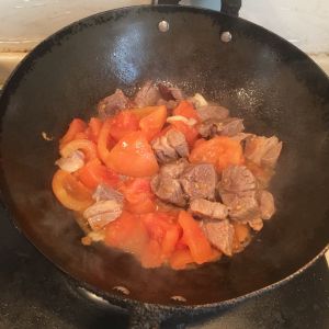 待西红柿炒出充分的汤汁后,放入焯好的牛腩,同时加入少许料酒,继续翻炒片刻。