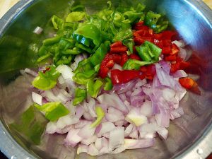 趁着烤茄子的十分钟,我们把酱料调制好,如果你觉得太赶,可以先把酱料调好再来制作茄子。青红辣椒切丁备用