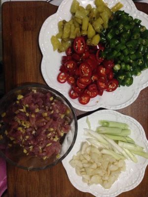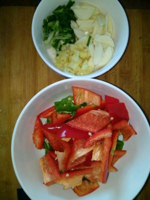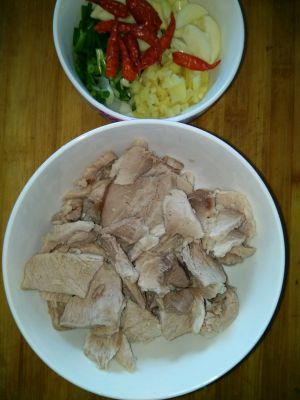 把食材洗干净切好,猪肉可把肥瘦分开,瘦的切条,肥的切片,辣椒斜切,蒜子切片!