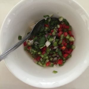 碗中放入蒜蓉,香油,生抽,盐,糖,鸡粉。调匀。