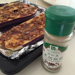 酱汁浇在茄子上,撒点黑胡椒粉。
