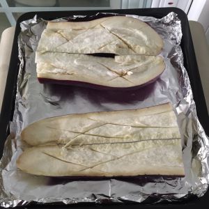 长条茄子切成两段,对半撕开。划花刀。烤盘上放锡纸垫底。先蒸8—10min。