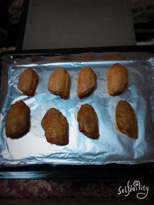 烤箱220度预热,腌制好的鸡翅放入铺了锡纸的烤盘中烤制30分钟