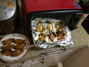 腌制好后摆盘,放入烤箱烤。 我使用的这个烤箱是双管的,温度调220摄氏度。放入前预热烤箱十分钟。 我使用锡纸包住烤架,避免出油、水滴下烤箱,所以需要翻面。烤15分钟后再翻另一面烤。如果你们喜欢烤得更黄更干的可以烤20分钟。不要烤焦了噢^_^。