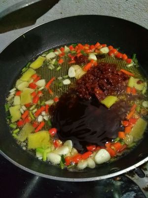 下姜蒜辣椒葱白爆香。