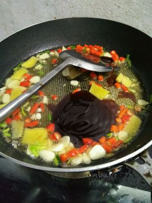 锅里油烧热,加入姜丝,蒜瓣,干辣椒,干花椒,大葱段,炒香