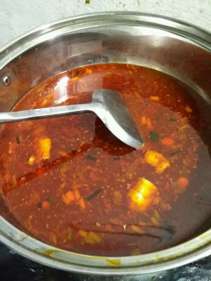 把锅放油烧热,放入郸县豆瓣酱炒出香味放入葱蒜干辣椒和花椒麻椒继续炒。