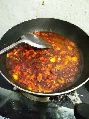 炒香后,加水,盐,鸡精,糖,老抽调味