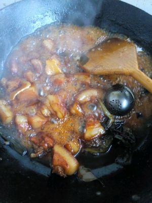 在糖色水中加入煸制好的五花肉 大火烧开 小火闷制 下入适量花椒 大料 桂皮 老抽调色后闷制软烂