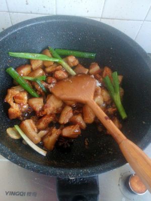 冰糖化开,炒糖色,不用把冰糖都化开就把焯好的肉放入翻炒。