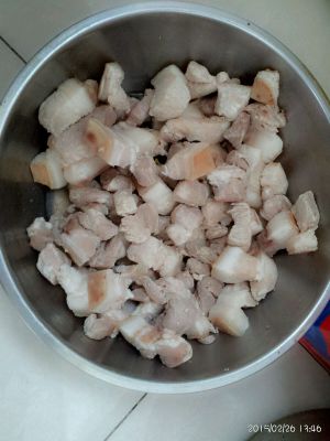 将五花肉切成小块,锅中放水,加入味淋(没有可用料酒代替)入肉块焯水,去血水,去沫,捞出沥干水分。