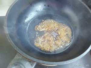 锅中入少许油,油热倒入冰糖,炒至完全融化,变色冒泡。