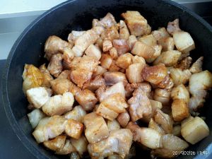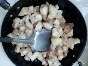 铁锅烧热,倒少许油,入姜片煸炒至变色,倒入肉块翻炒,将肥肉油逼出一些,至肉块变色,捞出备用。