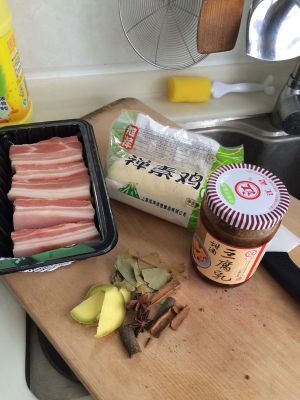 热油炒香老姜五香桂皮,放入五花肉煸炒至变色,多炒会儿比较好,只要不焦,要不停翻滚,入炖锅,加生抽,老抽,甜酒腐乳汤汁,糖,三碗水大火炖煮