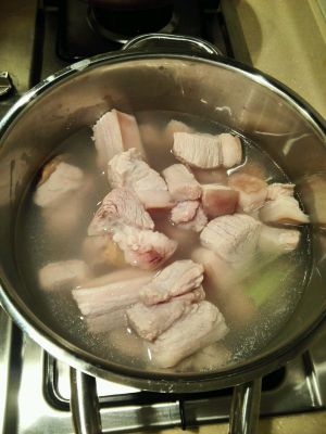 准备好材料,先将五花肉焯水再过冷河,清理干净。