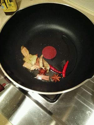 加入八角、桂皮、草果、香叶、生姜炒干并且炒香。