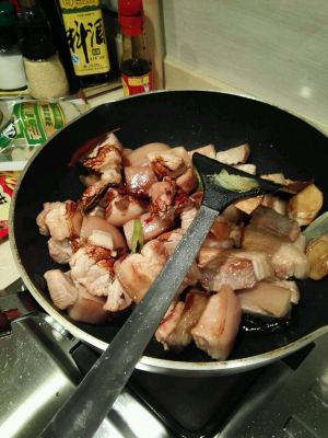 小火炒五花肉,这时会很粘,所以最好用不粘锅做这肉,炒到肉四面黄黄的
