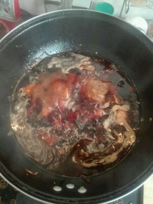 加入热水,盖锅煮烂、煮软,中小火