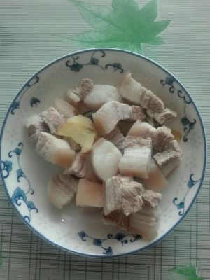 准备小锅,将五花肉放入小锅,淖一会,把上面的油沫捞出来,汤留着,五花肉捞出来放在盘子里