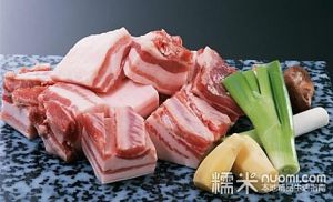 选择上好的猪五花肉,清洗干净后,切成小块(大小适宜,块大在煮的时候要稍长些)用烧开的水煮一下,等水开后将肉放置冷水中去除煮出脏物后,控干水备用。