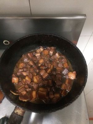 准备一个干净的炒锅放置找台上,锅热后放入白糖将其炒化至棕红色后放入备好的肉块翻炒至全部沾上糖色后放入老抽酱油再翻炒一会后,放入葱、姜、料酒和清水一起炖煮!