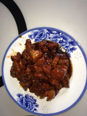 步骤… 首先是把肉切成肉丁,烧开水,找热水烫一下… 然后捞出来…放盘子里…然后另起锅放入油,放冰糖…小火熬制,熬成类似汤汁, 放入肉 翻炒一下,加一杯水,是先大火把肉烧开,后放入这些作料,(放入肉…老抽 八角 鸡精 味极鲜 葱 姜 一杯水,料酒)在小火慢蒸…熬制一个小时,出现干锅情况,中途可以加水…最后出锅,红烧肉…