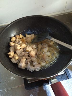 将肉设成小方块,下水焯一遍水,捞出控干水,再将比较肥的肉块放入干锅内,煸炒出猪油,倒掉猪油。(猪油可以留着炒菜哦)