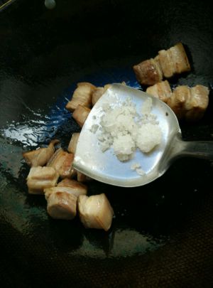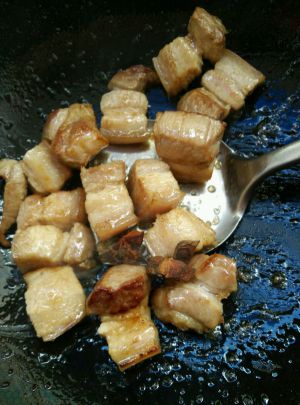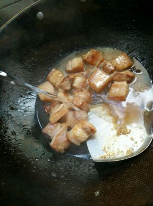蒜瓣去皮不要拍碎,姜切片。炒锅入少许油,油热转小火放入冰糖,用筷子不停的搅动冰糖,慢慢熬糖。待冰糖融化变成咖啡色的糖稀倒入五花肉,用锅铲迅速的翻炒。