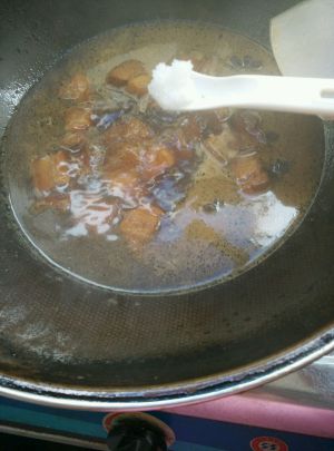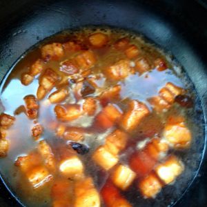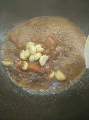 待肉块都裹了糖浆且都金黄,撒入十几粒花椒,放入蒜瓣,姜片,两颗八角,随意数量的干辣椒,翻炒几下,出香,倒入老抽,红腐乳汁,料酒,翻炒均匀,倒入没过食材的开水。大火煮开转中小火慢炖。我有加盖。
