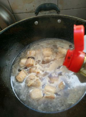 不时地开盖翻炒几下,以免糊锅。四十分钟后,放入泡好洗净的腐竹节。翻炒几下盖盖继续焖煮。