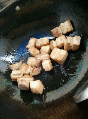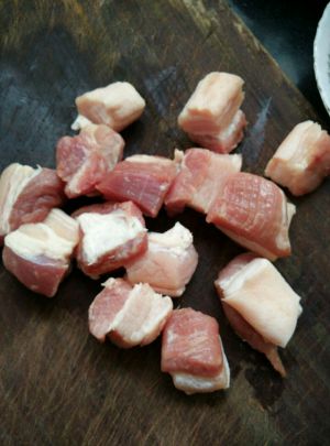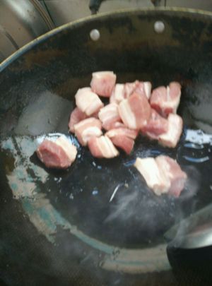 把肉洗净切成小块,锅里放少许油把辅料煎出香味,把猪肉放进锅里煎出黄色