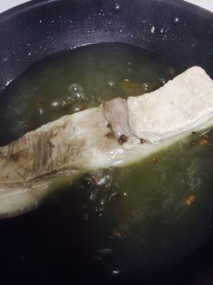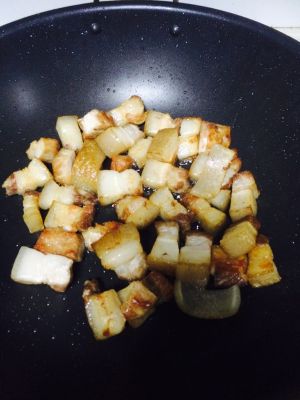 锅中热油,放入糖。炒出糖色将肉倒入锅中,炒至双面焦黄(为了防止油溅到身上,可以关火放肉,炒几下再开火)。