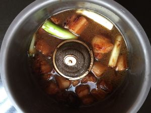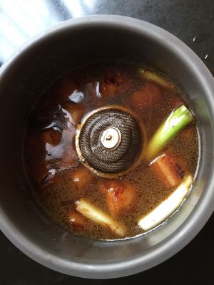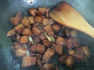 锅烧红、留底油、放入切好的五花肉、小火炒香、炒出五花肉里的油、放入大料、姜、继续炒香、加入适量啤酒(料酒都可以)倒入糖色、加适量生抽蚝油、胡椒粉、吃辣的可以加适量干辣椒调味、最后用高压锅上气压3分钟、最后倒入压好的红烧肉入锅收汁即可、可以加油豆腐、或者干香菇、按个人口味