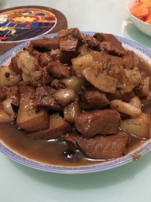 关盖开小火,炖煮45-50分钟,炖煮至松软,可以用筷子轻易插入五花肉内即可,然后开盖夹出桂皮、姜片、八角丢弃不用,转大火进行收汁,收汁粘稠即可出锅,如果老抽咸味不够,可以加入少许食盐调味。