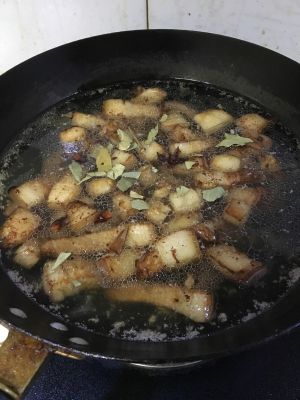 锅内烧油,放入冰糖,记得一定要搅拌,冰糖化了后,倒入切成块的五花肉搅拌上色,炒到五花肉颜色较深后,倒入刚才调好的料汁翻炒下,倒入水,没过肉,放入葱段、姜片、香叶、八角,还有之前煎过的鹌鹑蛋,大火收汁。