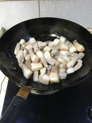 炒锅倒一点儿油,待油温7成热,将焯好的肉倒入锅中翻炒