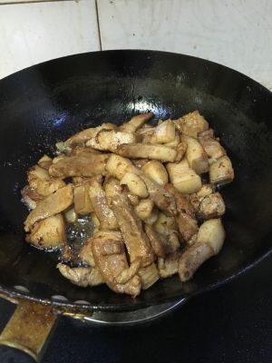 加一平铲勺老抽,冰糖后继续炒至所有肉都被酱油覆盖变色后捞出肉来备用,剩下的油可以倒在其他容器里,留着炒菜。