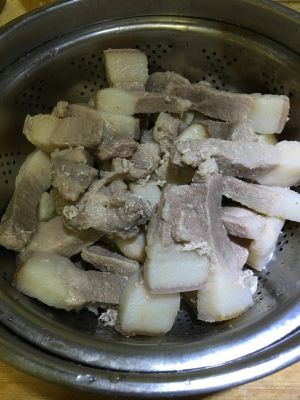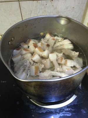 锅中清水加料酒、姜丝烧开,五花肉过热水,撇去浮沫。捞出切丁。