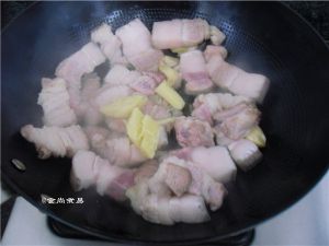 五花肉汆水后沥干备用,待糖色炒好后入锅翻炒,放入葱姜香料等辅料。