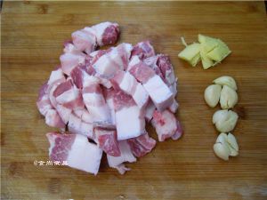 五花肉洗净切小块,蒜瓣去皮拍扁、生姜去皮拍扁