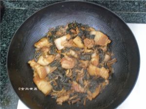然后加肉翻炒。断生加酱油上色。继续翻炒。等到肉表面基本熟了微焦。我觉得多炒一会肉更香。肉肥也要多炒一下。炒出油