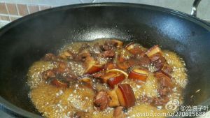 锅中放少许油中小火,加入冰糖小火注意⚠️是小火熬化至焦红色出现小泡泡时把肉快速入锅,注意⚠️冰糖化成糖色时变化很快千万别熬过了,熬过了会发苦