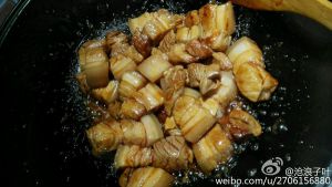就着锅中的油加入适量白糖,小火将糖炒至焦糖色稠状,倒入煸好的五花肉裹上糖色。
