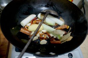 然后加一大碗水,加老抽,生抽,葱姜,八角,桂皮,花椒,香叶,大火煮开。